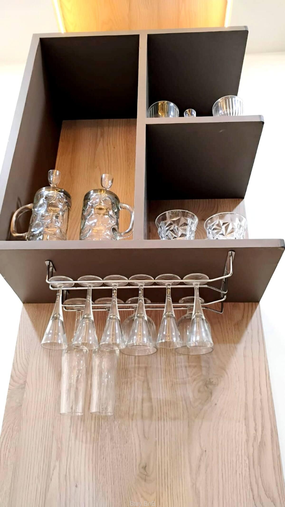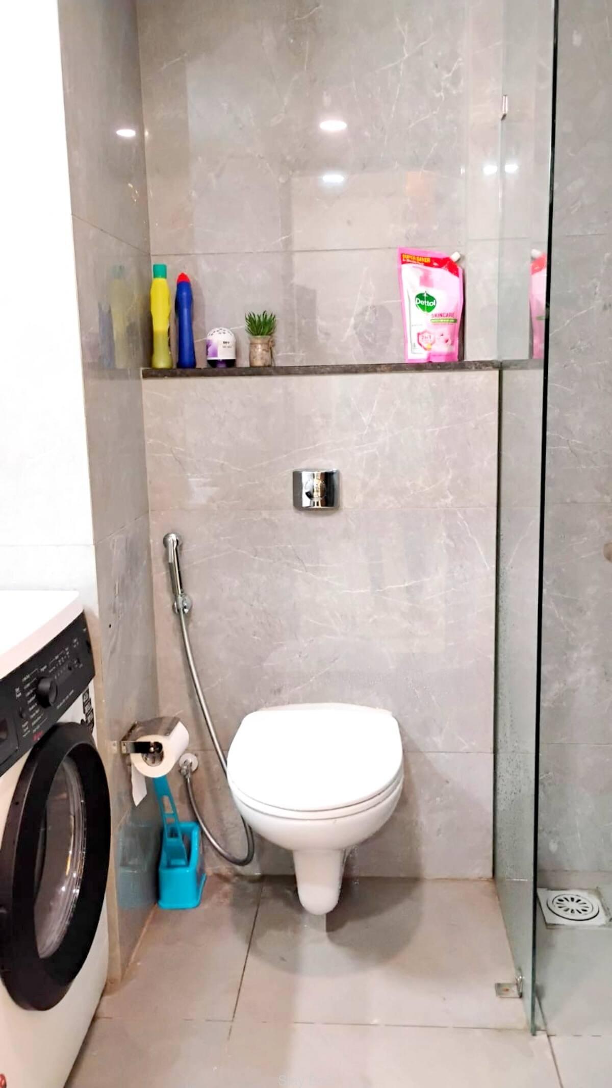 Every corner of this flat is thoughtfully interior designed with a calm color combinations. This fully furnished apartment in Pashan Pune is perfect for expatriates, corporate professionals or business professionals. Floor ceiling windows of this apartment offers panoramic views and ample natural light that makes guest feel fresh. The windows wall of spacious living room is covered with cream color curtains. Additionally, flat screen LED TV is available on this apartment for entertainment purpose. Chocolate brown plush sofa enhance the look of the living room. Small home bar is is there. Good quality of appliances are available on this service apartment for hassle free living. Good quality of washing machine, Refrigerator, Cook top, AC, etc., available on this apartment for trouble free living.