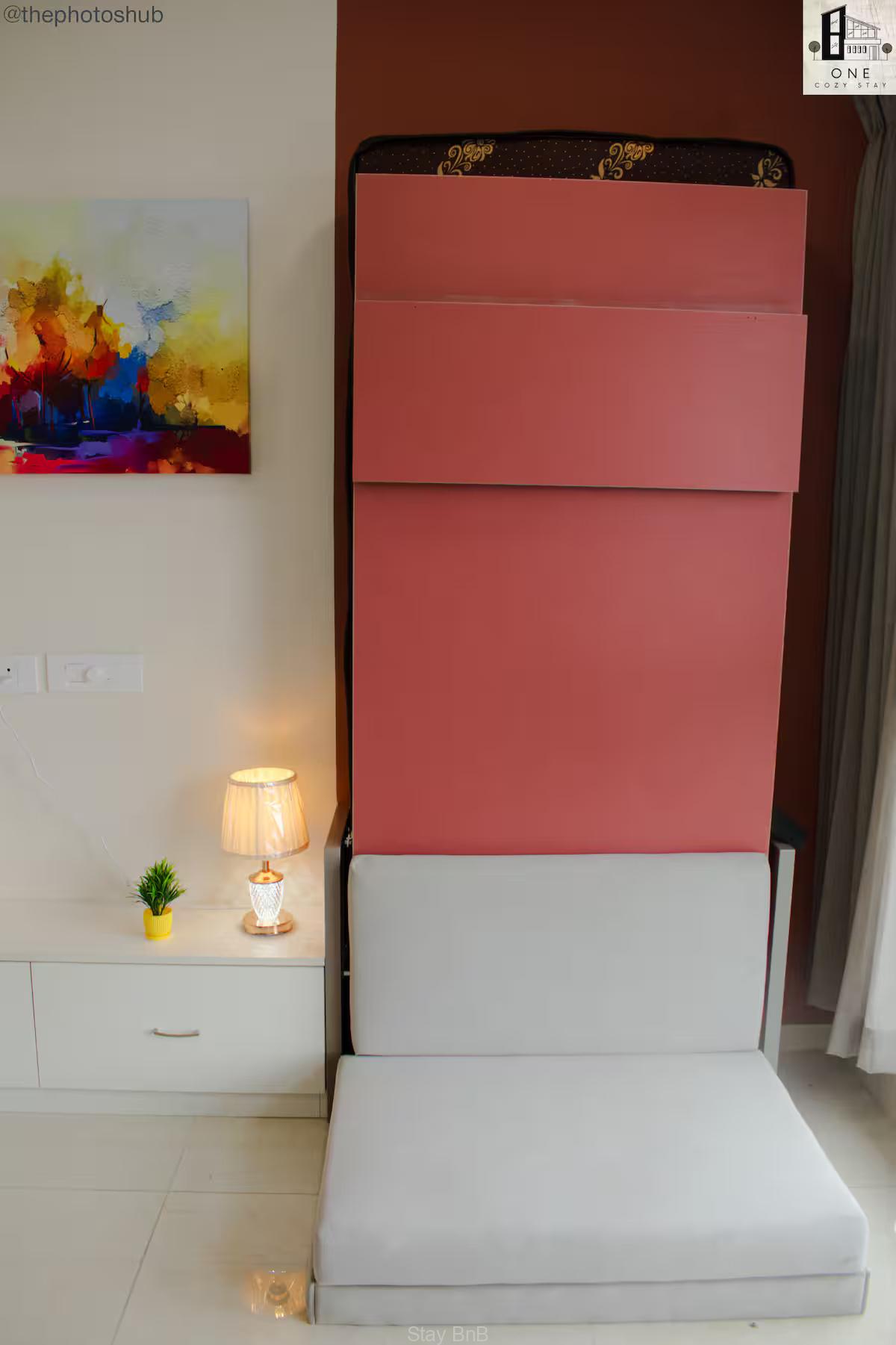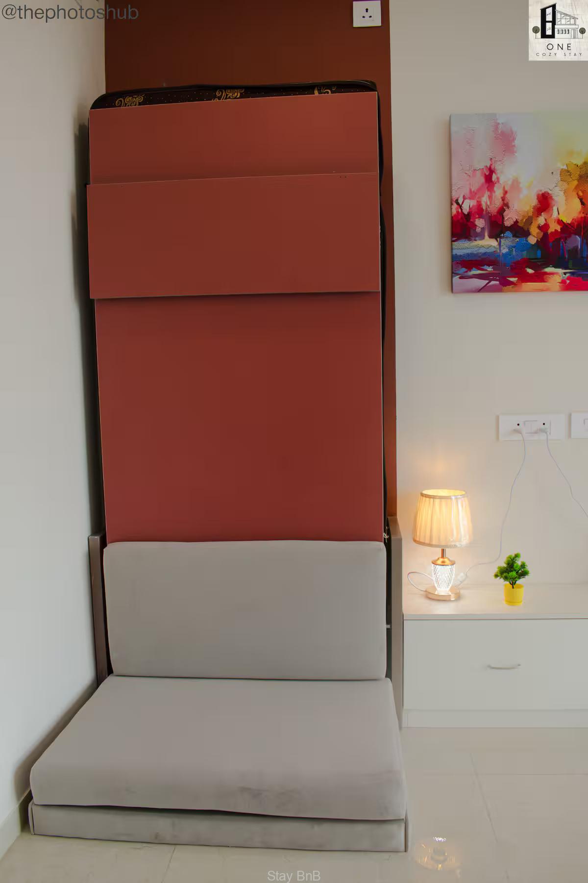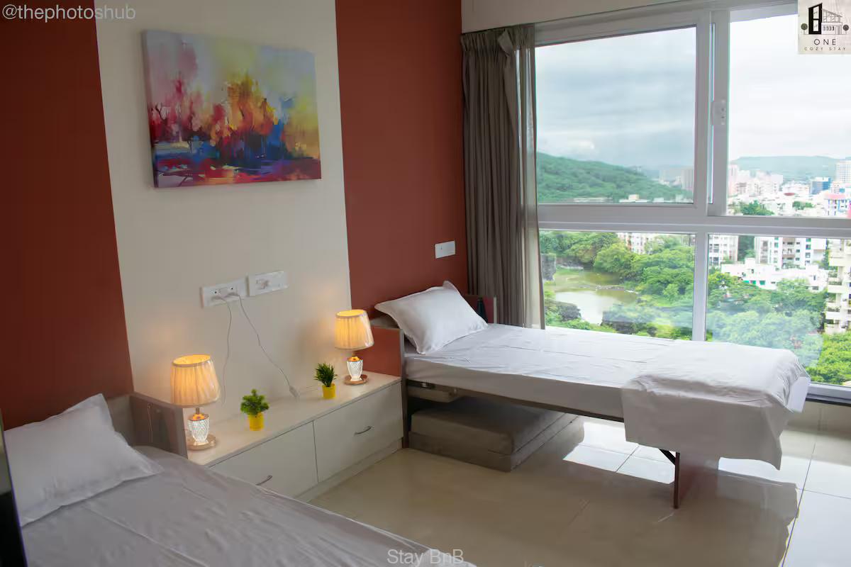 Every corner of this flat is thoughtfully interior designed with a calm color combinations. This fully furnished apartment in Pashan Pune is perfect for expatriates, corporate professionals or business professionals. Floor ceiling windows of this apartment offers panoramic green views and ample natural light that makes guest feel fresh. This service apartment equipped with flat screen LED TV, wall mount table beside the TV, aesthetic yellow color lamps. Good quality of appliances are available on this service apartment for hassle free living. Good quality of washing machine, Refrigerator, Cook top, microwave, AC, etc., available on this apartment for trouble free living.