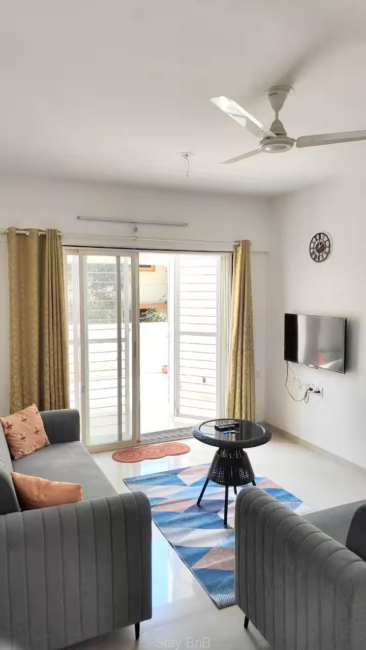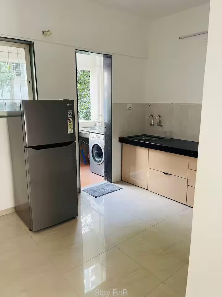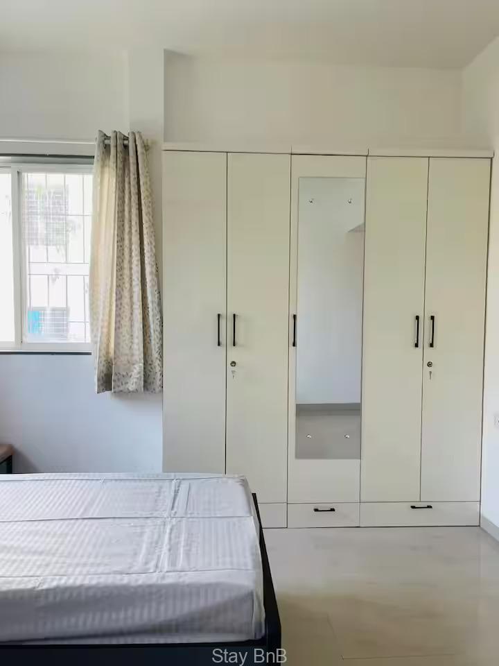 Stay Bnb presents this thoughtfully designed 3 bedroom service apartment in Pune offers  mixture of luxury, style and comfort. large window of your apartment gives ample natural light. For preparing delicious meals this service apartment features modern kitchen which boasts good quality of appliances, counter top. Each bedroom is serve with AC to control room temperature.