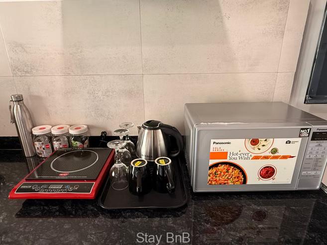 • Kitchen and dining: IFB Refrigerator, Microwave, cooking basics pots and pans, oil, salt and pepper Dishes and cutlery bowls, chopsticks, plates, cups, Freezer, induction cooker, Kettle, Wine glasses, Dining table