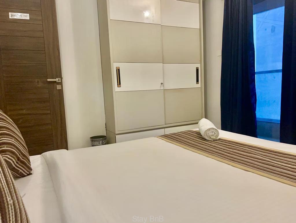 This apartment features two spacious and cozy bedrooms with attached bathrooms. A stylish living area is equipped with stylish and cozy seating area, dining table, AC, TV. Fully equipped and modern kitchen is set with modern appliances. This serviced apartment offers a trouble free stay with housekeeping, Wi-Fi and 24/7 security etc.