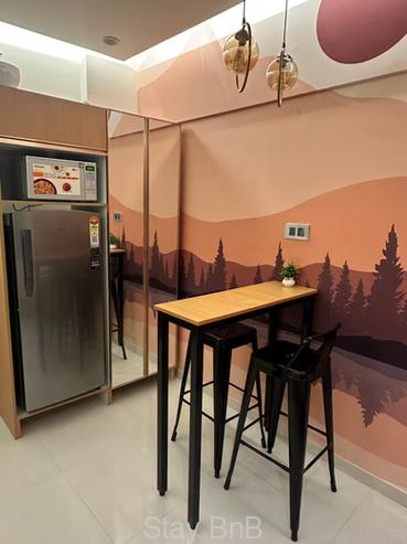 Reap the benefits of modern amenities like a Smart LED TV, high-speed WiFi network, refreshing air conditioning(AC), and plenty of natural light and ventilation. A fully equipped modern kitchenette area comes with an induction cooktop and a separate dining area is perfect for guests who love to cook.