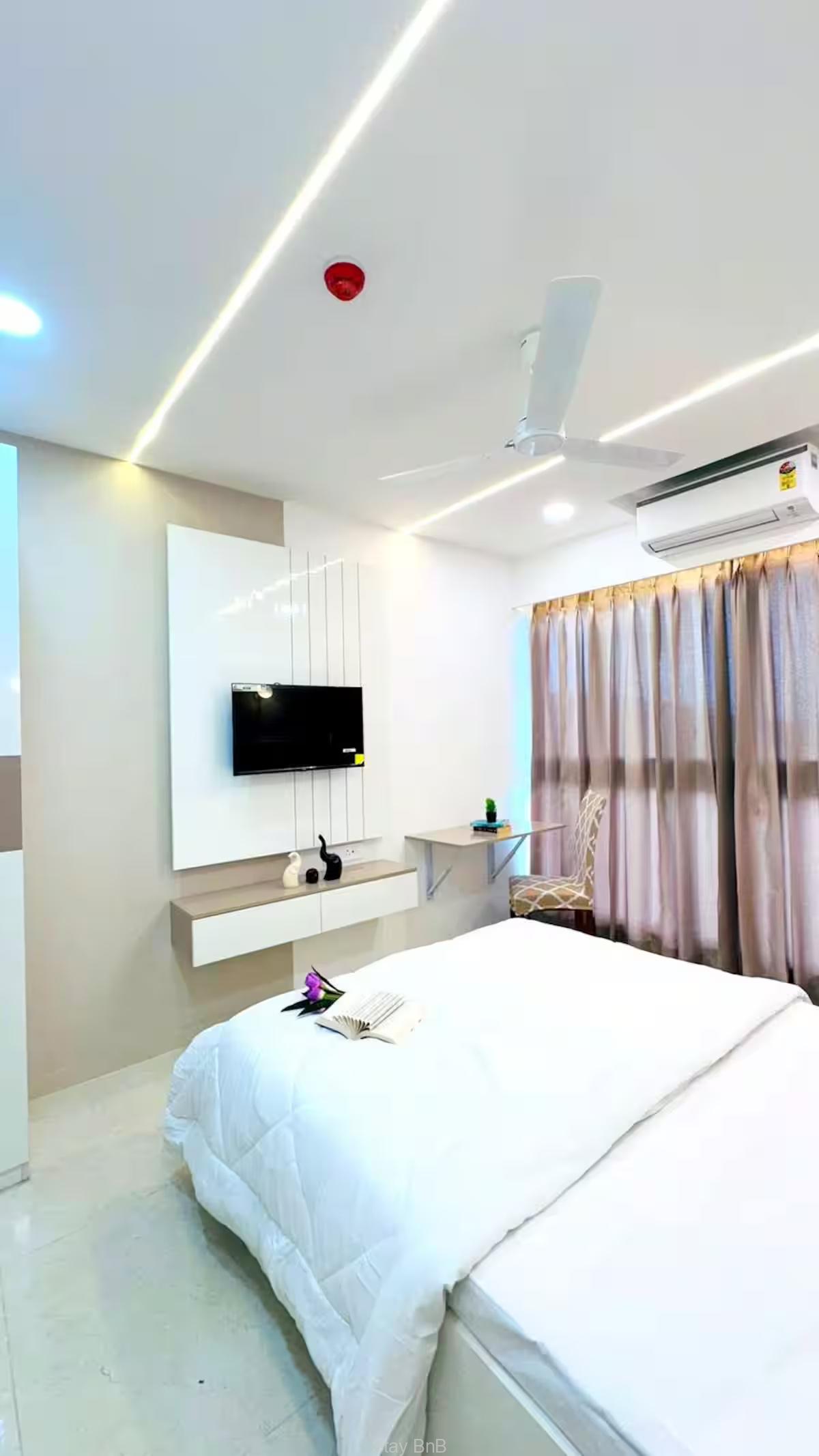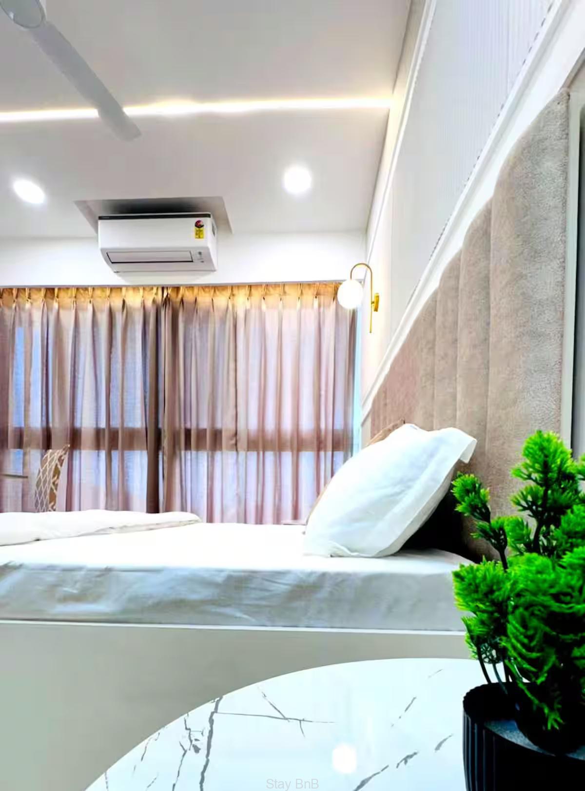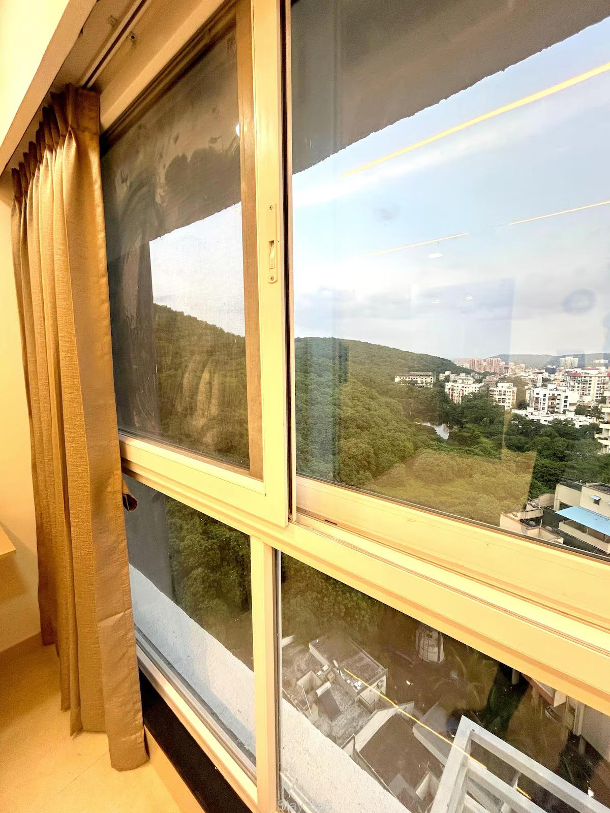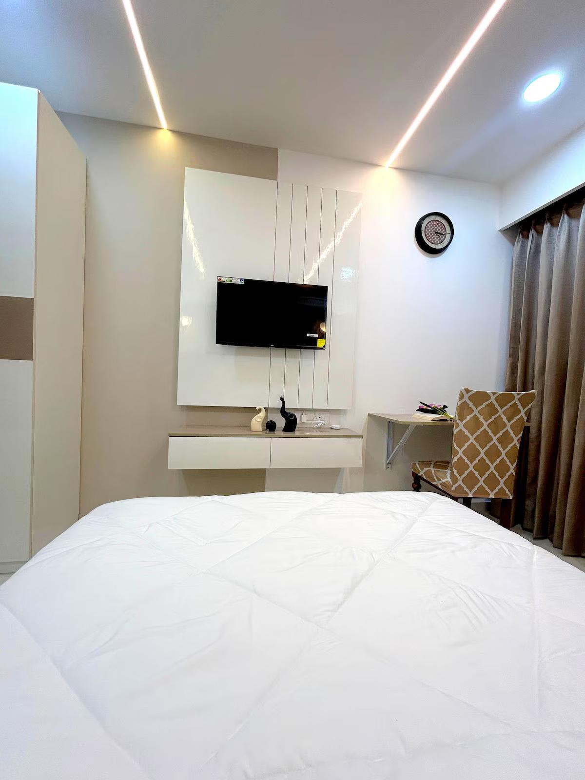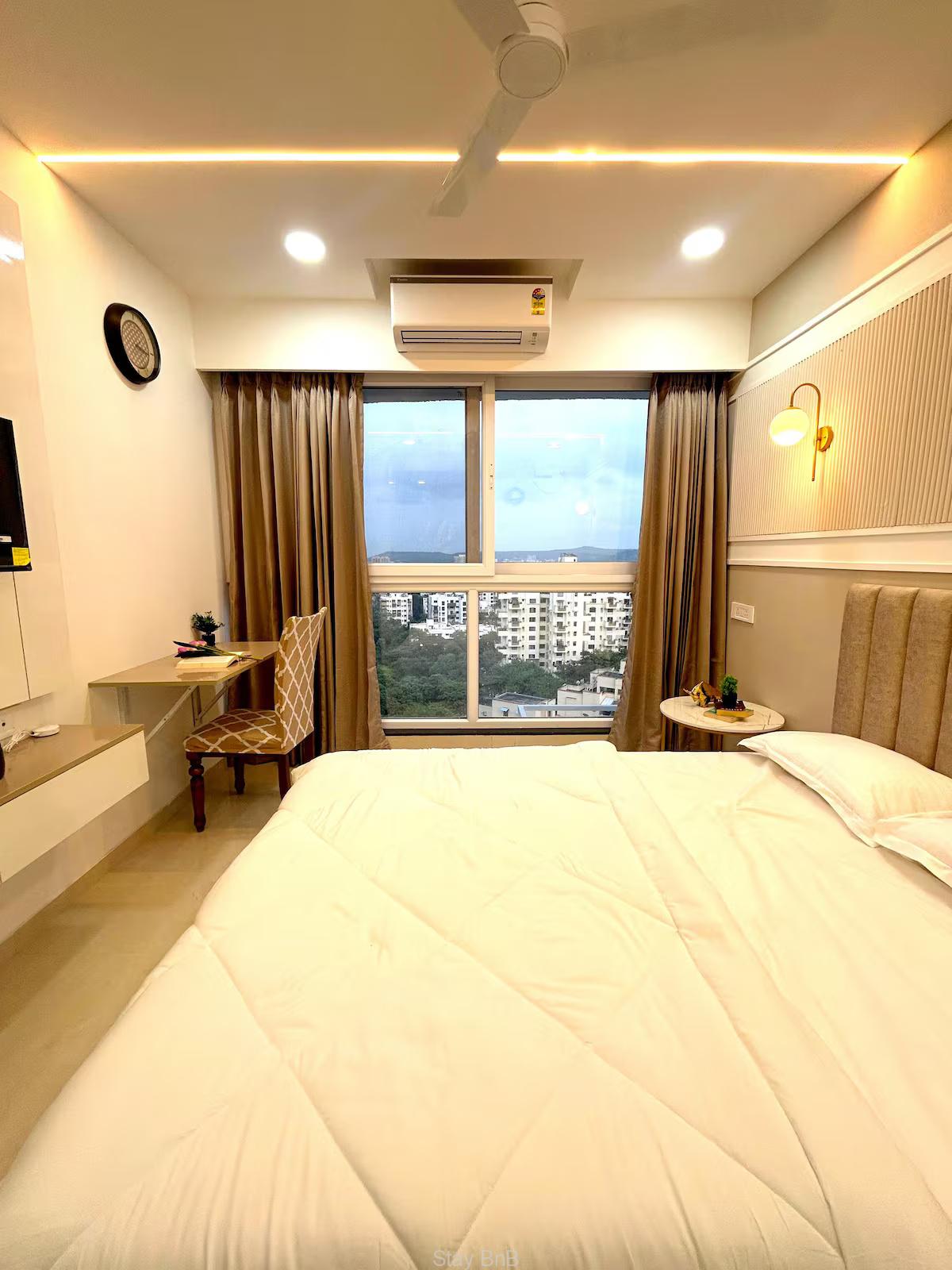 Welcome to our stylish, air-conditioned studio, perfect for 2 guests! Enjoy this home away home that boasts 200 sq. ft. carpet area and features a big smart LED TV, and all essential furniture and equipments. Enjoy the every corner of this flat that is thoughtfully interior designed. This fully furnished service apartment in Pashan Pune is perfect for expatriates, corporate professionals or business professionals. Floor ceiling windows of this apartment offers panoramic and forest mountain views and ample natural light that makes guest feel fresh. The windows wall of  spacious living room is covered with curtains. Additionally, flat screen LED TV is available on this apartment for entertainment purpose. Plush sofa set enhance the look of the living room. Good quality of appliances are available on this service apartment for hassle free living like washing machine, Refrigerator, Cook top, AC, etc.